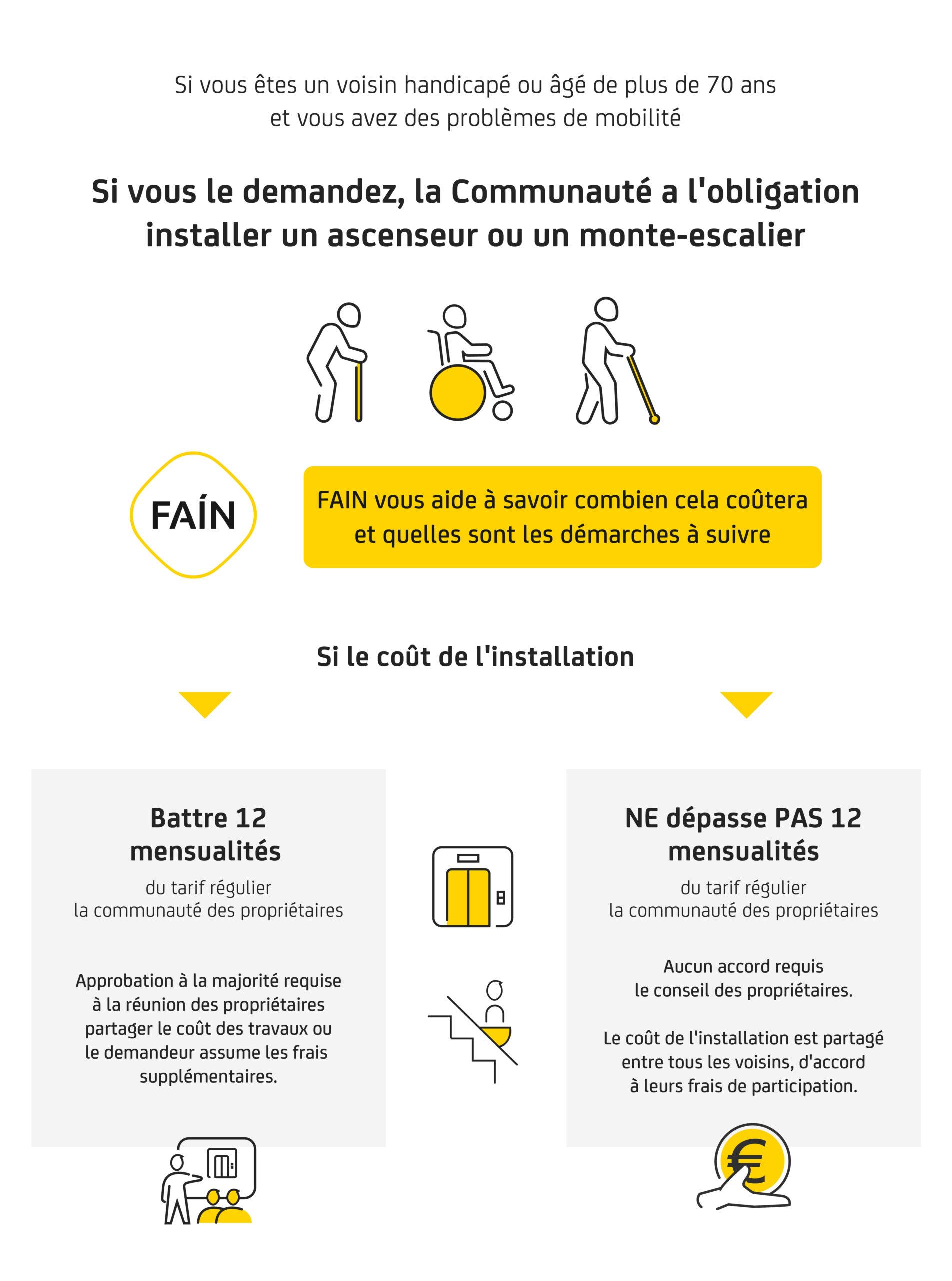La loi horizontale sur la propriété établit que dans tout logement, comme une copropriété, on doit garantir l’accessibilité universelle à toute personne qui en a besoin. Tant à la demande de la copropriété en tant que telle, qu’à la demande de tout voisin individuel. Il faudra réaliser les adaptations nécessaires pour assurer cette accessibilité. Afin d’assurer l’accessibilité universelle, on peut adopter plusieurs mesures, parmi lesquelles l’abaissement de l’ascenseur au niveau zéro ou, pour donner un autre exemple, l’installation d’un monte-escalier.